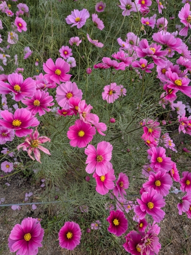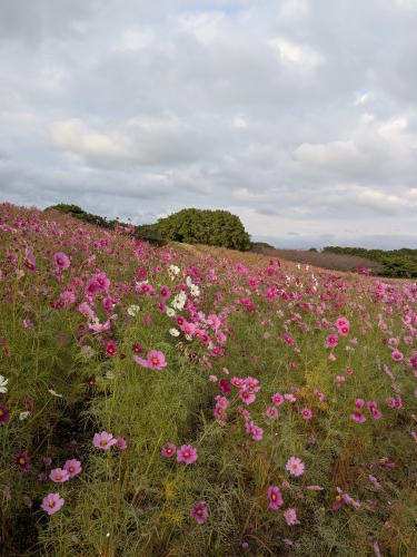 先日、ニュースで海の中道公園のコスモスがまだ咲いてるというのをみたので
