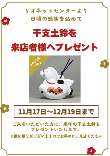 今年一年のご愛顧に感謝の気持ちを込めて、 ご来店の方に来年の干支「午(うま)」の土鈴をプレゼントいたします。