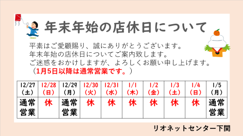 12月28日(日曜)は店休日ですのでお気をつけくださいませ。
