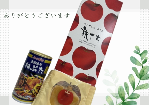 本日青森のお土産でリンゴジュースとお菓子をいただきました