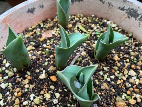 秋に球根を植えたチューリップが芽をだしていました!