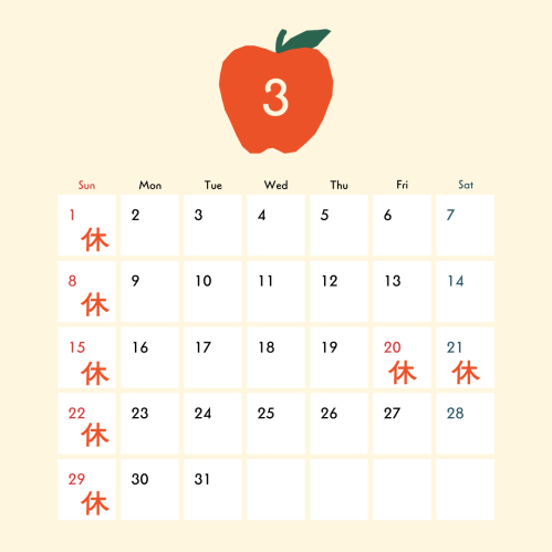 今月は20日の春分の日の祝日と21日の第3土曜日がくっついているため、3連休となります。