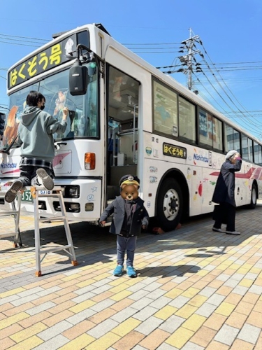 「兄ちゃんなかなかないから、是非お子さんとやってきなさいよー」なんてゆび指す先には西鉄バスを囲む人達。