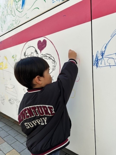 お絵描きの後は、当日来てたカメラマンの人にお願いされ、子供用の制服を着てバスの前で記念撮影。