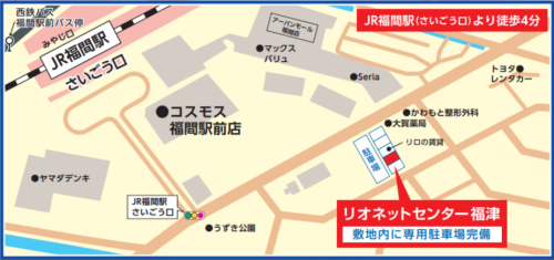場所はJR福間駅さいごう口から歩いて5分ほどの場所になります。