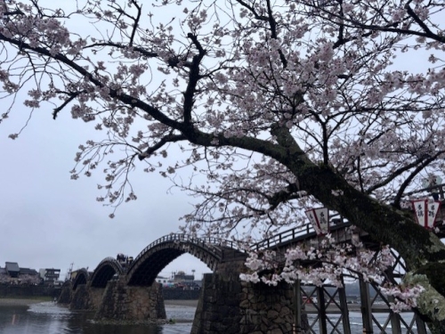 雨が降っており、濡れながらも桜を見ながら錦帯橋を渡りました