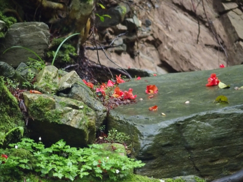 濡れた大岩に落花したツバキが、赤を添え落花してからも主張して