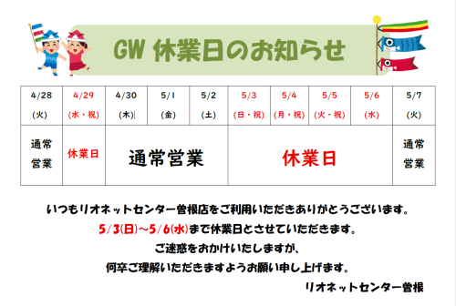 また、GW期間中の休業日についてもお知らせいたします。