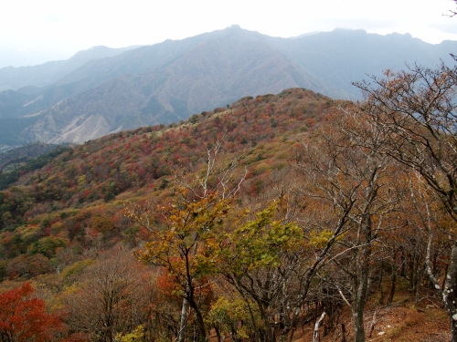 尾平越えから稜線に登りあがると、遠くに祖母山と紅葉のお出迎え
