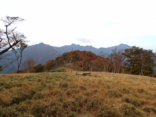 振り返ると正面に古祖母山、手前の1,457ピークは紅葉してます
