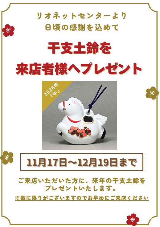 ご来店の方に来年の干支「午(うま)」の土鈴をプレゼントいたします。